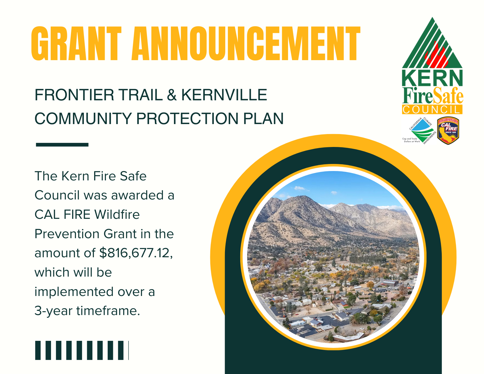 The Kern Fire Safe Council is proud to announce we have been awarded a CAL FIRE Wildfire Prevention Grant in the amount of $816,677.12. These funds will support critical wildfire mitigation efforts on the western edge of Kernville, primarily taking place within the Frontier Trail community and surrounding area.